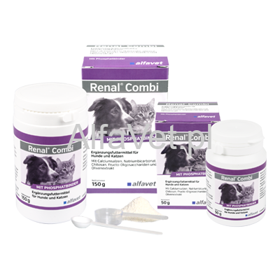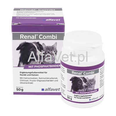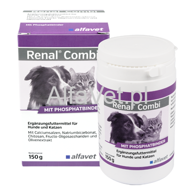 Renal® Combi to karma uzupełniająca dla psów i kotów, której główną rolą jest wiązanie fosforanów z diety dzięki solom wapnia. Preparat zawiera też składniki wspierające równowagę kwasowo‑zasadową, jelita (pre-/probiotyk) i ochronę antyoksydacyjną. Może być stosowany minimum 30 dni, a w razie potrzeby długoterminowo. Najlepiej mieszać go z karmą mokrą lub zwilżoną suchą.